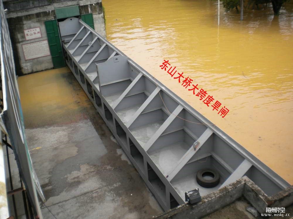 東山大橋旱閘閘門孔口尺寸為22m×3.7m(寬×高),閘門底檻高程77.21m(珠基,下同)。屬超大跨度的旱閘工程。其設(shè)計、制造、運輸和安裝的技術(shù)要求高。由我公司承建,該工程于2006年初動工,經(jīng)過半年緊張施工,在各參建單位的共同努力下,于2006年6月11日一次整體吊裝成功。2007年度被省水利學會評為科學技術(shù)三等獎;2008年度獲梅州市科技進步三等獎。