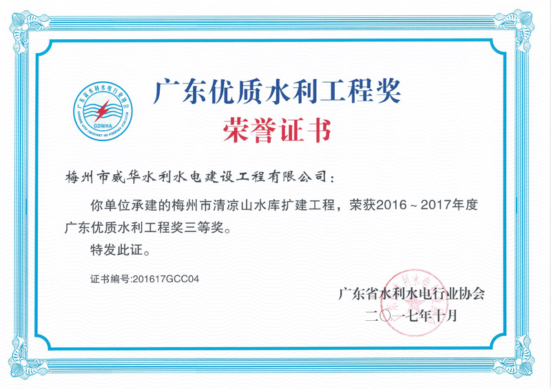 2017.10廣東省優(yōu)質(zhì)工程獎三等獎(清涼山水庫擴(kuò)建工程) (廣東省水利水電行業(yè)協(xié)會)